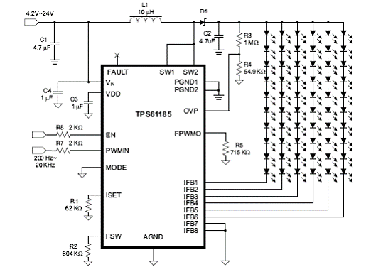 图1.TPS61185方框图图2.TPS61185典型应用电路图图3.TPS61185带关断ISO-FET的典型应用电路图图4.TPS61185可编频率调光的典型应用电路图
