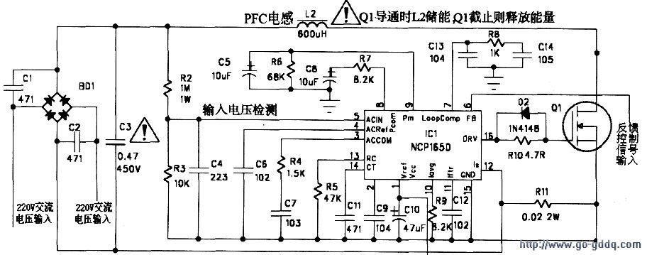 PFC电路主要由IC1(NCPl650)、Ql、L2及外围的电阻电容组成。局部图见下图。下图中,ICI采用NCPl650,芯片是一个宽电压输入范围的功率因素校正控制器。主要用于50/60Hz电源电路,该控制器具有以下特点: