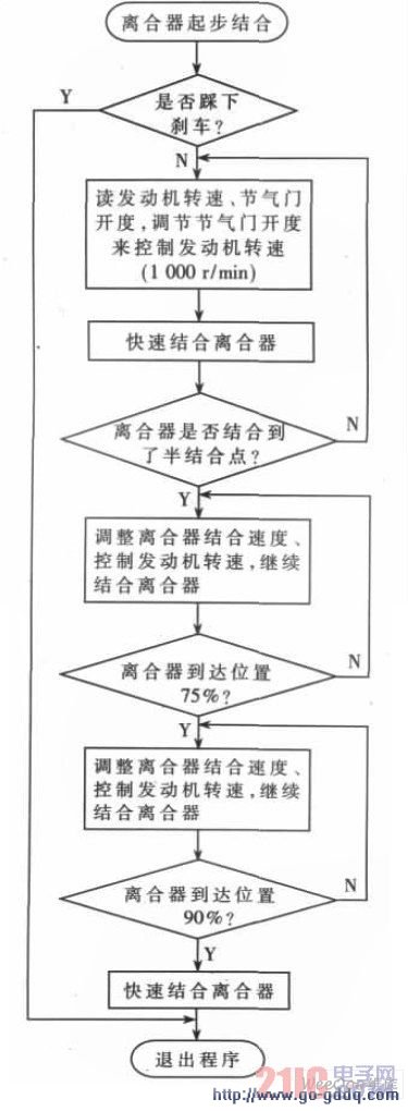 离合器的控制程序包括三个部分: 离合器分离控制程序、起步结合控制程序、换挡结合控制程序。其中分离控制程序比较简单,ECU 得到分离指令后, 离合器全速分离, 并且准确地在完全分离点停止即可。离合器的控制难点在于起步结合控制。离合器的起步结合过程既要保证车辆起步的平稳性、舒适性、起步不熄火, 又要保证起步的快速性, 减少滑摩功的产生, 延长离合器使用寿命。因此, 要取得较好的控制效果除了对离合器的结合量进行控制外, 还要对离合器的结合速度进行控制, 并通过与发动机的协调控制, 提高控制效果。图4 为起步结合控制软件流程图。换挡过程中离合器的结合控制与起步控制在控制策略上类似, 在此不再赘述。