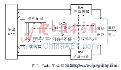 在完成交织模块的基础上对Turbo码编码器进行FPGA设计。Turbo码编码器由RSC(递归系统卷积码)子编码器、交织器、复接电路等构成,硬件实现框图如图3所示。