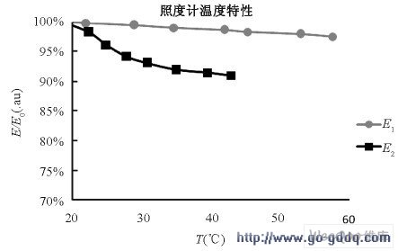 为系统研究照度计的温度特性,我们分别对某公司生产一级品照度计的光探头和整体照度计进行了温度特性测试实验,其结果分别为下图5 中E1 和E2 两条曲线。
