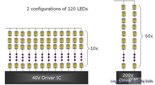 作为一个极端的例子,如果一个电视机里全部背光LED都串联在一起,那就只需要一个单路的LED驱动芯片,LED的亮度会完美匹配。但是通常一个普通尺寸的液晶电视需要上百颗乃至数百上千的LED,驱动这样一串LED所需的驱动电压将达数百伏(>300V)甚至上千伏,这对家用电器的安全性和效率是一个很大的挑战。另外,该方式无法对不同的LED进行调光,因此只能用于侧投式的驱动架构。