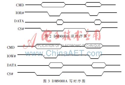 图2和图3分别显示了DM9000A的读写时序,由图可知,DM9000A的读写操作与一般的异步存储器相同。根据芯片资料,编写读写寄存器的子函数。
