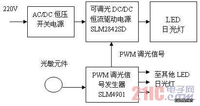 为了减小在强日光下不必要的照明,可以采用光敏自动调光LED日光灯(或任何其他LED灯具)。它的方框图如图11所示。