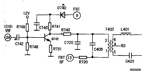 (3)动态聚焦电路:动态聚焦电路是为了改善CRT边缘聚焦(一般为散焦)而设置的。如左图所示,Q742、T403及IC101的(24)脚(VDF)内部电路等构成动态聚焦电路。
