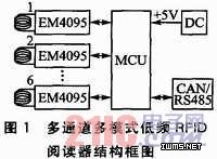 图1为多通道多模式低频RFID阅读器的结构框图。阅读器包含6个读取通道,每个通道包含一个EM4095芯片,它们在同一个MCU的程序控制下工作。设计6个通道的目的是组成多种有效的工作模式,便于实际应用。阅读器每个通道的解码均由MCU的程序控制完成,这样可以大大地简化硬件设计、降低成本。阅读器通过CAN总线或RS485总线与上位机相连,进行数据通信,接受工作模式的设定指令和其他的控制指令,上传各通道读取的标签信息和阅读器本身的工作状态;同时也可构成集散型系统,便于大规模应用。