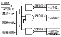 当向STIM写入通道命令和通道地址后,NCAP就要通过NTRIG信号触发命令所要求的动作。电力系统同步相量测量要求采样的时间精度高达1 μs[2],为了保证动作执行的时间准确性,NTRIG信号同时接入STIM里的多个传感器或者执行器件。如图2所示,一个智能传感器接口模块里有多个传感器通道,每个通道采集一路信号。当网络应用适配器把一个传感器或者执行器通道打开时,AT89S53使能对应的传感器或者执行器的使能信号,这个使能信号和NTRIG信号相“与”后的输出使能相应的传感器或者执行器。这样NTRIG信号就可以准确地触发正确的通道动作。