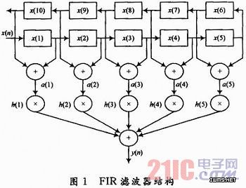 这样,10阶FIR滤波器的结构可以描述为:输入样本x(n)经过10阶移位寄存器延迟后得到10个具有不同延迟的抽头,将对称的抽头值相加后再与相应的权系数相乘,5个乘积相加就得到滤波器的输出值。滤波器结构如图1所示。