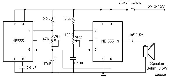 VR2 sets the siren frequency. Adjust VR1 and VR2 to suit your taste.