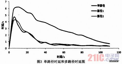 本文通过分析时延特性来说明对网络性能的改善。网络中的节点加上负载大小是随机的,以N2到N4为例来分析端到端时延特性,通过对比单路径和多路径的端到端的时延来实现。单路径表示N2-NO-N4,多路径包括路径1和路径2,其中路径1表示N2-N6-N4,路径2表示N2-N0-N4。可以看到通过多路径路径1和路径2相比于单路径可以有效地减少端到端的延迟。路径1和路径2的端到端延迟相差不大,说明负载在网络中是较为均衡的。
