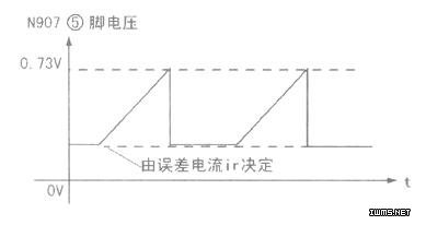 该电源采用初级取样方式进行稳压,取样电压为N907(4)脚电压。N907内置的误差放大器将取样电压转换成误差电流,经R968、R967到地,参见图16。由于N907(5)脚电压为Ir在R968上的压降与漏极电流在R967上锯齿波电压之和,即(5)脚电压波形的底部电压由i,电流决定,如右图所示。当(5)脚电压峰值超过比较器1的门限值0.73v时,比较器翻转,开关管截止。