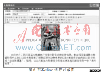 系统在内容管理模块中使用了开源项目FCKeditor,它是一个专门用于网页上的所见即所得的文字编辑器。它的轻量化、部署简单等特性使得它可以与PHP、JavaScript、ASP、ASP.NET、ColdFusion、Java以及ABAP等不同的编程语言相结合。站群管理系统中使用FCKeditor时对它进行了修改,主要包括修改部分源代码使其支持分布式部署,所有提示语言的汉化、对ConnectorServlet的改写使其支持汉字文件名和目录名的上传和创建、页面样式的修改等。经过运行,修改的页面编辑器在内容管理中发挥了很大作用。其发布新闻内容时的截图如图6所示。