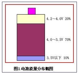 目前手机使用的电池都是锂离子电池,在手机工作时,电池不断放电,电池电压不断下降,电池放电的电流不同,电压下降的曲线速率也不同,一般来说,在电池电压3.5V~4.2V之间集中了90%的电池能量。电池能量分布如下图所示。