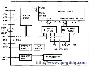 。2)、背光分为(EL冷光)背光和LED背光两种。3)、行驱动时COM1-COM64(或X1-X64)为行位置,由芯片HD61203做行驱动。4)、列驱动时Y1-Y128(或SEG1-SEG128)为列位置,由两颗芯片HD61202驱动,第一颗芯片U2驱动Y1-Y64,第二颗芯片HD61202驱动Y65-Y128。5)、左半屏/右半屏控制由CS1/CS2片选决定。CS1=1、CS2=0时,U2选中,U3不选中,既选择右半屏。6)、列驱动器HD61202有512Byte的寄存器,所以U2和U3加起来共有1024Byte寄存器。
