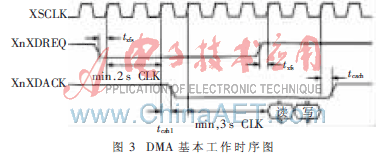 S3C6410可支持4个DMA控制器,用于系统总线内部或与外围总线之间的数据交换,每个控制器包含8个通道,支持8/16/32 bit传输。现以外部DMA请求为例简要介绍DMA的工作过程。图3所示为DMA基本工作时序。