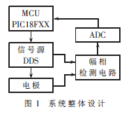 神经肌肉疾病评估系统的整体设计如图1所示。MCU通过串行端口SPI控制直接数字频率合成器(DDS)产生正弦交流激励信号(本文采用阻抗最为敏感的50 kHz频率),通过电极作用于患者的局部区域,同时提取出含有阻抗信息的测量信号,幅相测量电路作为神经肌肉疾病评估系统的关键部件,提取测量信号的幅值和相位信息,经过AD转换,最后结果送入MCU进行处理和显示。