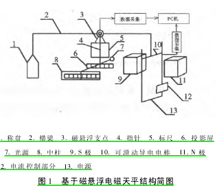 基于磁悬浮的电磁天平是利用杠杆原理,把待测物的质量通过电磁力平衡原理变换为电流检测 ,利用安培力 F = BIL 当 B 与 L 确定时根据 F 与 I 的一一对应的关系,同时根据 G = F 通过 A/D 转换器就可以直接读出被测物体的重量。其结构图如图 1所示。其主要分为三个部分: 一是载重部分即称盘1; 二是平衡部分,包括横梁 2、指针 4、标尺 5、投影屏6、光源 7、中柱 8; 三是配重部分包括 S 极 9、可滑动导电电棒10、N 极11、电流控制部分12、电源13。载重部分的作用是用于放置被测物体; 平衡部分是通过光电放大系统即标尺上的零点和投影屏的零刻度线重合来判断天平是否达到平衡; 配重系统是利用通电回路中的导电电棒在磁场中受到的电磁力对被测物体进行配重,并由电流控制部分控制电流大小来调节电磁力大小,使天平平衡。