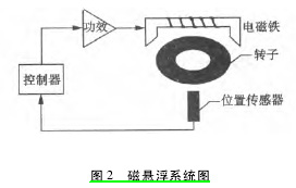 平衡部分的支点采用的是磁悬浮轴承作为支点,其系统图如图 2 所示,它是由转子、传感器、控制器和执行器四部分组成,其中执行器包括电磁铁和功率放大器两部分。采用磁悬浮做支点最大的优点就是可以减少支点与被支撑面间的摩擦,从而提高测量精度。