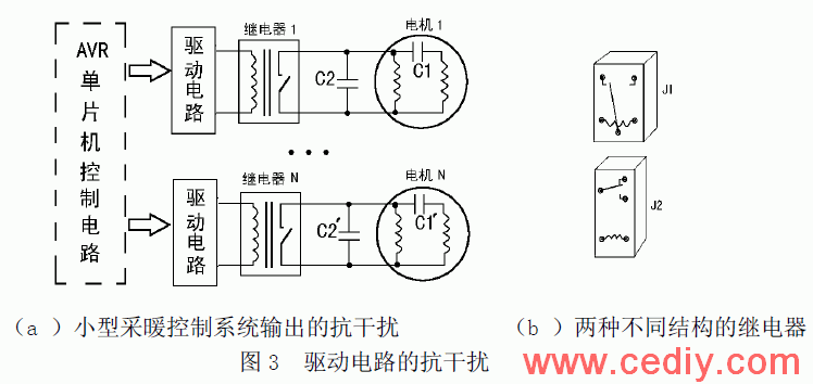另外继电器内部的交流 220V接点离继电器线圈很近,很容易产生静电干扰,严重时会使液晶显示器乱码。实践证明继电器结构不同其抗静电干扰能力也不同。应尽量选择继电器线圈与接点距离较远的为好,如图3(b)中的 J2结构的继电器(JQX14F系列)等。