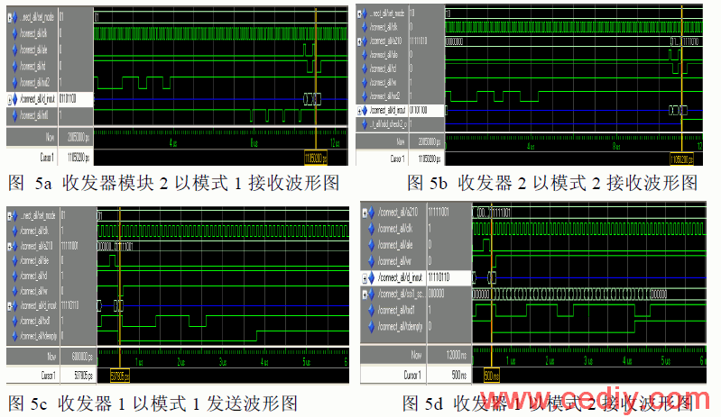 测试结果我们还可以看到:1)芯片各收发器模块可以同时工作 2)发送与接收可以同时进行 3)接收缓存正常,并且在接收数据不足 8字节超时后时会自动停止缓存,然后向芯片中断管理模块提出中断请求 4)中断信号能够正常输出 5)各收发器的中断请求无遗漏 6)收发器模块的数据被读取完毕之后,中断标志自动清除,芯片不再发出中断请求信号。