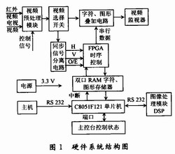 随着数字技术和单片机技术的高速发展,大规模可编程逻辑器件的普及,可设计用一片高性能单片机,利用现场可编程器件FPGA对采集的视频数字图像做预处理,完成时序控制逻辑,实现视频、图形、字符叠加,经融合后的视频信号实时送给监视系统进行显示。
