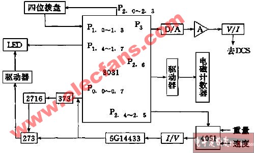秤的二次表原理图如图3 所示(不包括电源部分) ,是用8031 单片机为CPU 来设计的。重量和速度的电流信号经多路选通器4051 选通分别进入I/ V 网络中,转变成0. 4~2 V 的电压信号,输入A/ D5G14433中。8031 的P2. 4 、P2. 5 口作为4051 的选通信号,A/ D被当作CPU 的外部数据存储器的一个单元, 用MOVXA , @Ri 指令将A/ D 数据从P0 读入。因运行程序较小,只用了一片2716EPROM ,且其地址线只用了P0. 0 - P0. 7 ,当8031 读2716 的数据时,8D 锁存器373 锁存2716 的地址。此外P0 口还轮流输出瞬时流量值至发光8 段数码管(包括小数点) L ED ,其显示格式为××. ××(t/ h) 。4 位L ED 的选通信号由P1. 4 -P1. 7给出。二次表的量程由外部的4 位KBM 型拨盘