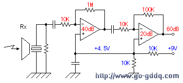 超声波接收头和IC4组成超声波信号的检测和放大。反射回来的超声波信号经IC4的2级放大1000倍(60dB),第1级放大100倍(40dB),第2级放大10倍(20dB)。 由于一般的运算放大器需要正、负对称电源,而该装置电源用的是单电源(9V)供电,为保证其可靠工作,这里用R10和R11进行分压,这时在IC4的同相端有4.5V的中点电压,这样可以保证放大的交流信号的质量,不至于产生信号失真。
