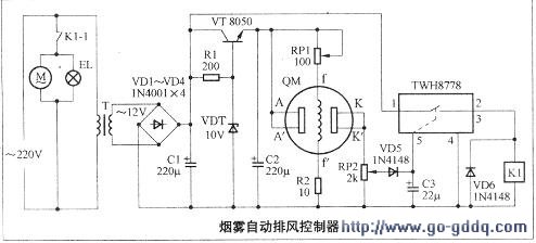 电路原理烟雾自动排风控制器电路见下图所示,控制器由电源电路、QM气敏器件、TWH8778功率开关集成电路等组成。