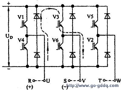 如图所示。假设在某一瞬间,电源的R端为“+”,而S端为“-”,则在逆变管V3导通的瞬间,电流将经VDl和V3而短路。V3将立即烧坏。由于六个逆变管以极高的频率(载波频率)不断地交替导通着,而变频器从跳闸到切断电源是需要时间的。所以,六个逆变管将很快地全部损坏。