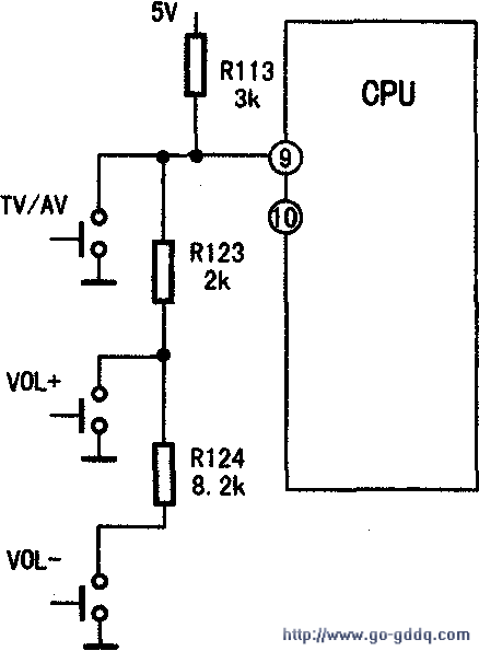 下图电路中,CPU的⑨脚电压有几种可能:如果三个键(TV/AV、VOL+、VOL-)都没有按下,则⑨脚电压是5V(没有分压),这时CPU什么也不干;当按下TV/AV键,则⑨脚电压是0V,CPU将完成TV/AV转换功能;当按下VOL+键,可以算出⑨脚电压是2V(R113与R123分压),CPU完成VOL+功能;同样,当按下VOL-键,⑨脚电压是3.9V,CPU完成VOL-功能。可见。