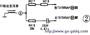 只好在行输出变压器磁心上用外层绝缘的导线绕4圈.一端接地,一端接原⑤脚焊点(注意绕向,如果不正常可把导线两端对调),加绕行逆程脉冲绕组。如此处理后开机,彩色、字符出现,一切正常。