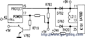该机采用典型的A3机芯电源电路,开机测开关电源+B端(+130V)输出电压为0V,为进一步确定故障部位,断开行负载,用100w灯泡作假负载,开机灯泡亮后熄灭,测十B端电压由+130V后降为0V,说明保护电路动作或保护电路本身有故障。该机—721SP)(15)脚保护端用于检测脚+9V供电和(25)脚+24V供电(见附图),测CPU(15)脚+5V电压正常,(17)脚电压为+4.1V(正常时为0.1V),断开D792和D793至CPU@脚的跨接线,即去掉电源保护,再次开机CPU(15)、(17)脚电压恢复正常。测ICl01(11)脚电压为+9V正常,而其(25)脚无电压,顺着(25)脚向前查,+24V端电压正常。查R470断路。更换R420并恢复D792和D793至CPU(15)脚的跨接线,去掉假负载,恢复行负载,开机一切正常。