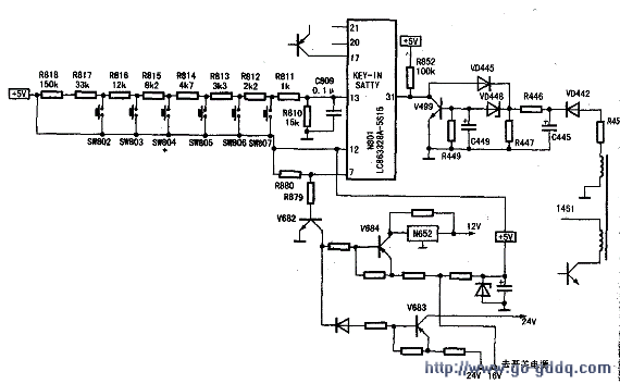 维修就这样陷于困境之中,由于手头还有许多机子待修,故决定将这台机器先放一放,工前工后又隔三岔五地对其进行蜻蜓点水检修,逐渐发现以下的蛛丝蚁迹:(1)接通电源之后,机器有时直接进入开机状态,有时处于待机状态,此时按压遥控器上的“开/待机”键,时而能开机、时而不能开机,即遥控器开机时灵时不灵;但与之相反,按面板上的“频道下/上”键则“百发百中”,每次均能正常开机;(2)机器经常出现自动地在AV状态与TV状态之间互相转换,或自动出现模拟量调整菜单、功能设置菜单或执行自动搜索功能,在字符显示混乱之时说不定机器又会什么时候“吱”的一声便关机了;再开机也许可以工作一段时间,但何时故障重演则无任何规律可言;(3)在频繁的开机关机中监测31脚的电压,发现每次都是开机时由2V升至3.2V,关机时由3.2V降至2V,又测得其对地正反向阻值均在分析认为机器在“忠实”地执行某一项指令,这指令是谁发出的呢?是遥控器吧?将其电池取出,故障依旧,说明故障与其无关。那么故障在面板控制电路吧?该机面板电路采用电压比较式按键电路,共计有“频道∨/∧”、“音量+/-”、“菜单”、“AV/TV”六个按键,无“POWER”按键,难道也会有“POWER”功能?