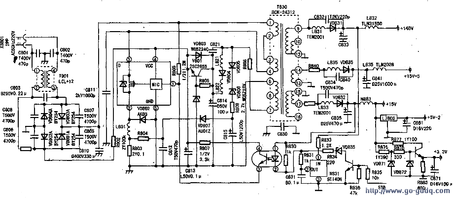 通电试机,灯泡亮一下便不亮了。关机,一会儿又开机,灯泡又只亮一下,+B只有50V左右便没有了。测量+300V滤波电容上电压久久不能泄放,N801①脚、②脚、⑤脚电压为0V,③脚为320V,④脚供电在13V左右变动。查启动电阻R805、R802都未见损坏。当时天色已晚,便向顾客说明原因,摘板带回店里修理。