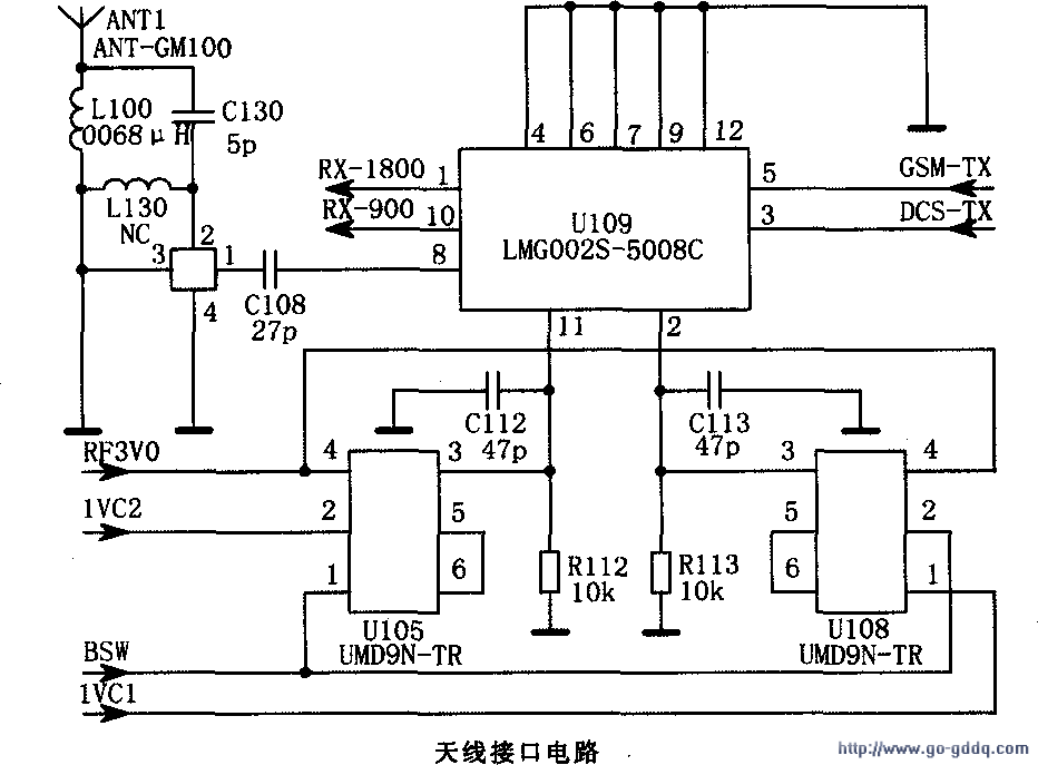 这种情况重点检查接收电路和其相关的逻辑控制电路。检查重点是:天线接口电路的ANT1天线触点、U109(LMG002S-5008C)天线切换芯片(见图);U201(TRF2253RGLR)射频信号处理芯片和U203(TRF603PHPR)频率合成芯片的引脚是否存在虚焊、BPF1~BPF5接收滤波器等是否存在不良。