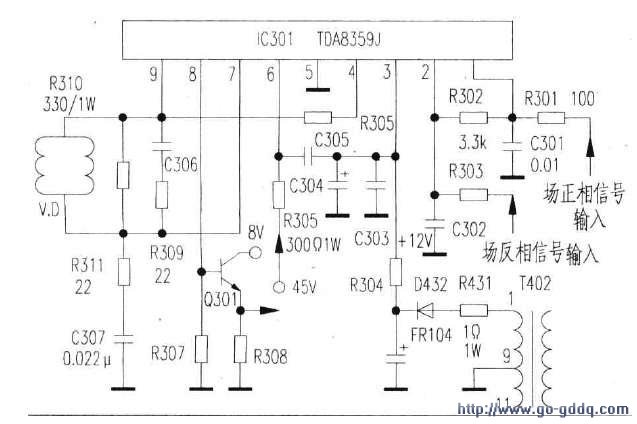 对于此类问题,毫无疑问检测的重点应放在场扫描电路上。此机采用的是飞利浦TDA9830超级单片机,场输出集成电路IC301采用的是TDA8359J,见附图。