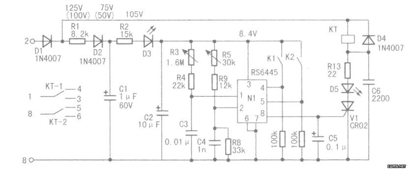 由图可知,供电部分分为两路,一路经D1、R1、D2、R2、D3串联后向集成电路N1供电,另一路经D1向继电器KT的线图供电,所以应重点检查第一路。