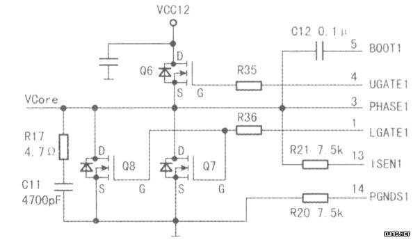 首先用万用表测量主板上的小l2V电源接口对地阻值,发现其阻值仅为57Ω,而正常的同样主板上应为410Ω左右。判断主板上的l2V供电电路部分存在着短路情况。如图所示,这块主板采用的是Intel的VRM9.1供电标准,使用L6917的电源控制驱动一体化IC。由于在CPU供电电路中,最容易发生短路的地方就是CPU供电的上管,于是先测量其中的一相供电的上管Q6(l5NO3),将万用表置于二极管挡,用红、黑表笔交替测量Q6的任意两极,发现Q6的D极和S极阻值只有10Ω,说明Q6已经被击穿。将Q6用热风枪吹下,再测量l2V电源端对地的阻值,其阻值已经恢复正常。换用新的l5NO3MOS管重新焊接到Q6的位置,再对l2V电源口的对地阻值进行测虽,测得阻值为400Ω左右,说明此主板的l2V供电部分不存在短路。插上CPU、内存、显卡后,主板加电正常开机。此板修复。