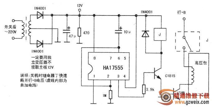 经过一番细心琢磨和补焊,并换上原型号行管试机,几秒钟后图声出现,彩色图像和行幅都很正常,开机半个小时后行管微热,不料关机后测行管又短路了。再换再烧,每次都是不关机看多久都不烧,遥控器关机也不烧,直接关机就烧,到底是哪里的问题,遂在行电路中加入如下图电路,让行管在关机时快速断电,以保护行管的安全。此后电话回访,电视机不再烧行管。