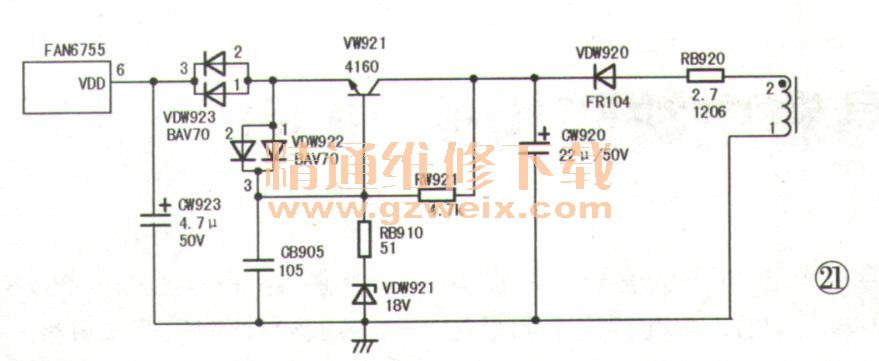 分析检修:该机采用三合一主板,板号是35016968。试机发现,光栅闪烁的原因是背光亮度闪烁。检查开关电源输出电压,发现有明显的波动现象。检查开关电源的取样稳压电路,未发现异常,转向检查开关电源初级电路,发现芯片FAN6755的⑥脚(VDD)的供电电压波动。检查该脚外接供电电路,如图21所示,当代换了18V稳压二极管VDW921后试机,故障排除。看来该机故障系VDW921性能不良所致。