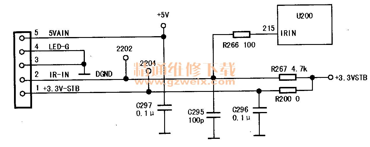 检修流程:用户反映冷机遥控器起作用,收看一二十分钟后遥控器就完全无作用了。换用新的遥控器,故障没有排除;测试遥控接收头IR脚电压在故障时为1.5V左右,更换同型号接收头,故障依旧。测试IR上拉电阻R267(4.7kΩ)正常,代换对地电容C295(100pF)无效。根据经验此机芯PCB板漏电的比较多,果断将插座P203的②脚外接电阻 R266 (100Ω)到U200的215脚之间的铜箔割断,飞线后故障排除。相关电路见图1。