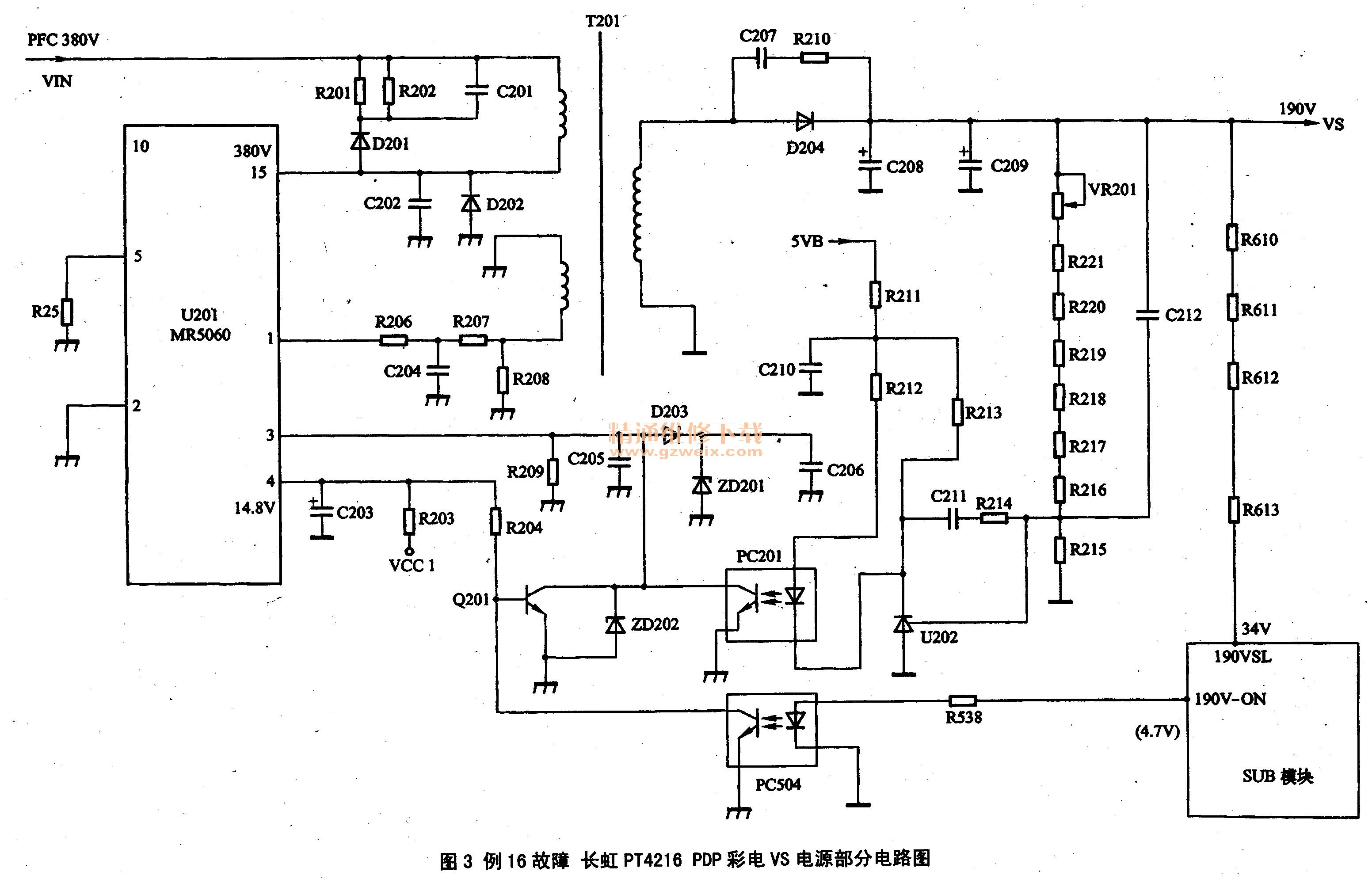 拔掉VS的输出连接插头,仍无输出。测量VS对地短路,断开VS整流二极管D204后测量,不再短路,说明整流管已损坏七检查VS初级处理厚膜集成电路U201(MR5060)各脚对地电阻,未见异常。