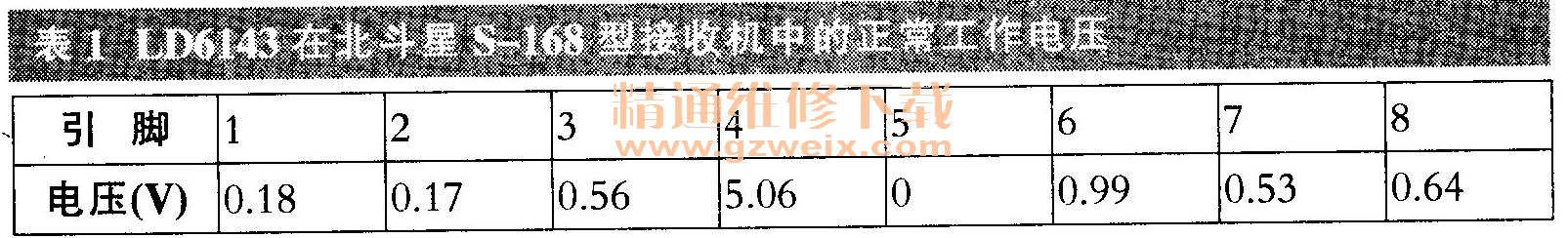LD6143采用SOC-8封装,单5V工作电压,内置三通道4阶标清视频滤波驱动器,是专门替代无源LC滤波器和驱动器的单片集成电路,与传统的2阶或3阶无源方案相比,它输出的视频图像质量更高,其内部框图如图2所示。LD6143内部的二极管钳位和偏置电路可以接收交流(AC)或直流(DC)耦合信号,每个输出可以AC或DC耦合驱动单(150Ω)或双(75Ω)负载,输入直流偏压使DC输出偏移280mV。 LD6143在北斗星S-168型接收机中的正常工作电压见表1(用优利德UT33B型万用表20V挡测得),供参考。