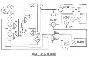 故障检查与排除 主轴电动机飞转,说明主轴伺服电路不良, 伺服电路如图4所示。 当在CD换片机内插入碟盒时, CPU的24脚输出+3.3 V左右的控制电压,使IC304输出+8 V左右的电压, 向IC20l供电。同时CPU控制升降机构使升降伺服机芯上升到第1碟的位置, 接着CPU通过IC201控制加载机构 ,将第1张碟片载入伺服机芯内并被固定在旋转平台上。在此期间, IC201的29脚为0 V, 开关S1与1 / 2UCC相连,使放大器C的正、 反相输入端电压相等, 放大器输出为0 V, 从12、 13脚输出的SP+、 SP-驱动电压差为0 V, 主轴电动机不转。