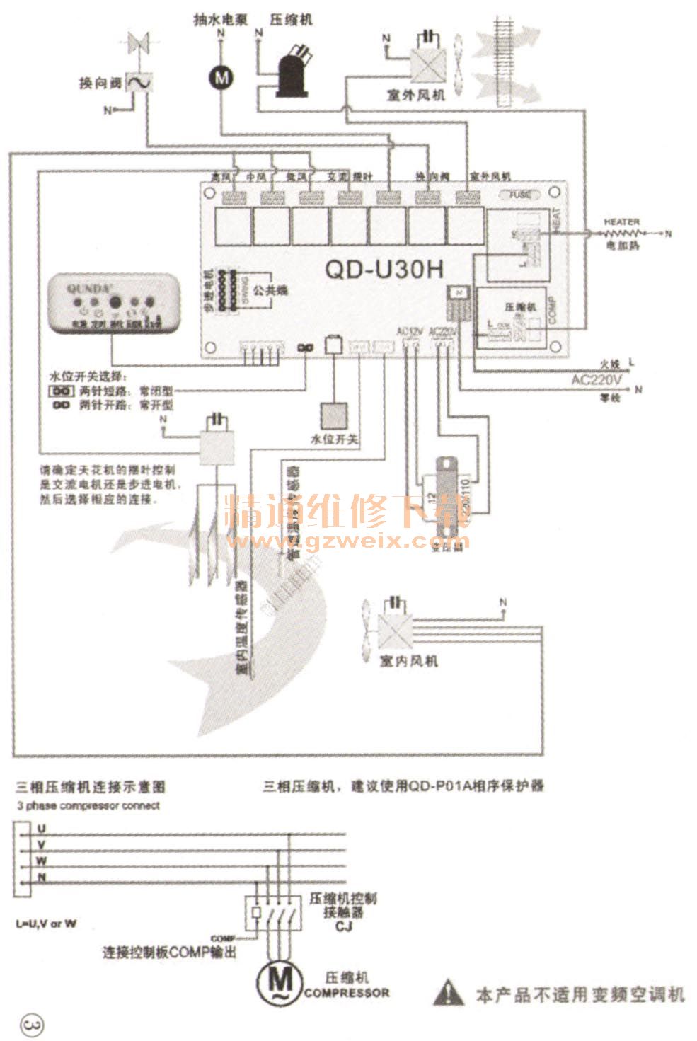 该型板的连线如图3所示。如换板后通电没有蜂鸣声,应先断电检查控制压缩机的继电器的两接线是否正确,COM端应接电源进线,ON端应接压缩机、加热器的控制线。