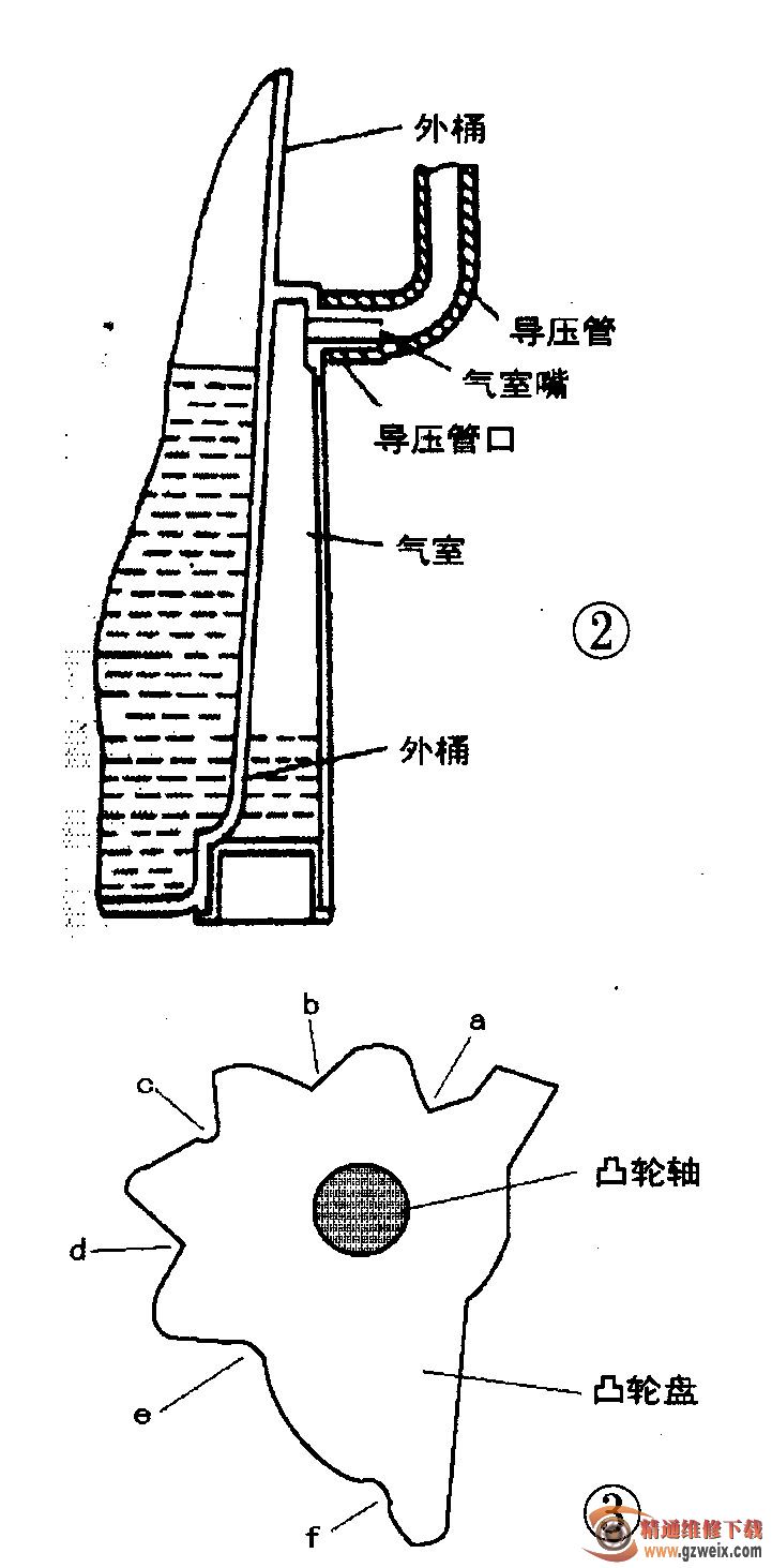 水位开关凸轮轴的顶端装有水位旋钮,用户可以通过拧动旋钮来设定水位,当凸轮轴转动时,凸轮的a,b,c,d,e,f六个点分别与杠杆接触,如图3所示。杠杆在不同位置时压力弹簧的压力也不相同,开关闭合点和复位点也不相同,因此形成高、中、低等不同的水位,同时水位开关还设置了补进水功能,若开始洗涤后,用户感觉水位不够,可以将旋钮拧到“补进水”位置,就开始补水,手松开后,停止补水。