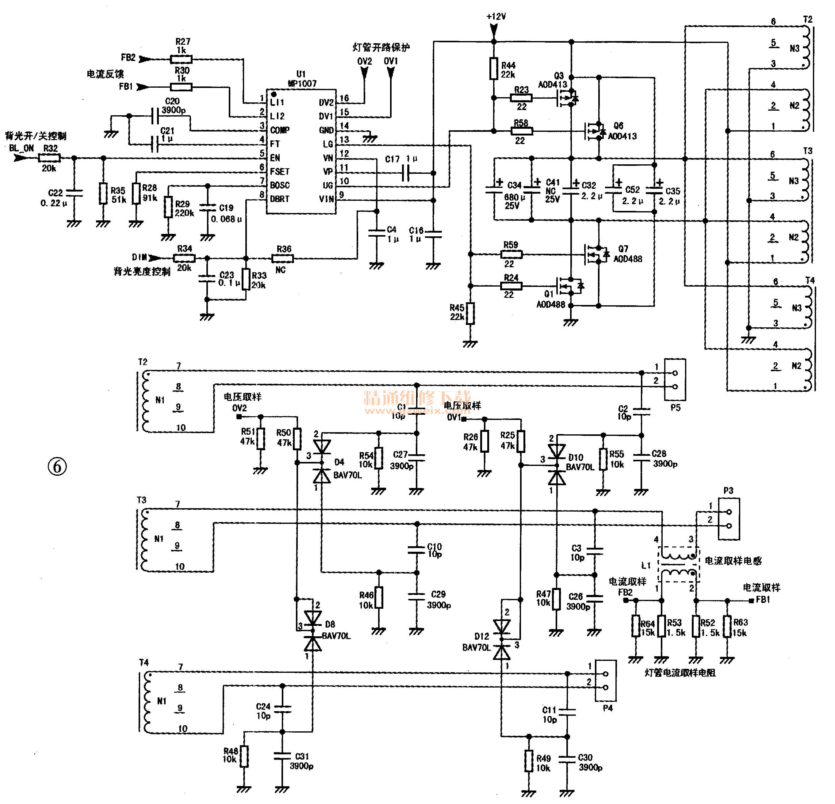该板背光驱动电路的控制芯片是MP1007 (U1),这是一款固定工作频率的变频控制器,是MP1008的升级版本,输出两路驱动脉冲,推挽驱动外部功率型MOSFET管,以驱动多只冷阴极荧光灯管。