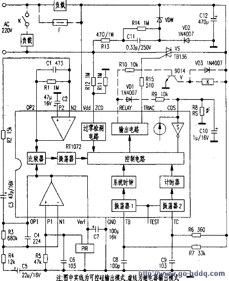 RTl072是PIR传感器控制芯片,可应用于红外感应式运动人体的控制方面,如自动通风系统、移动感应探测、自动照明、门铃系统和防盗报警器等。RTl072内部电路主要由运算放大器、滤波电路、时钟电路,主控制电路、过零检测电路、CDS电路和输出驱动电路组成。