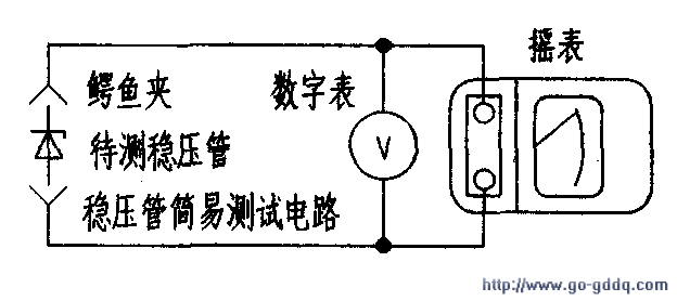 由于稳压管的稳压值有一定的离散性,另一方面对ZD5稳压值要求又比较严格,为此应对稳压管进行测试,测试电路如图所示,利用摇表发出的高压很容易将稳压管击穿,而击穿电流却很小,所以此法既安全又快捷,而且也比较准确。