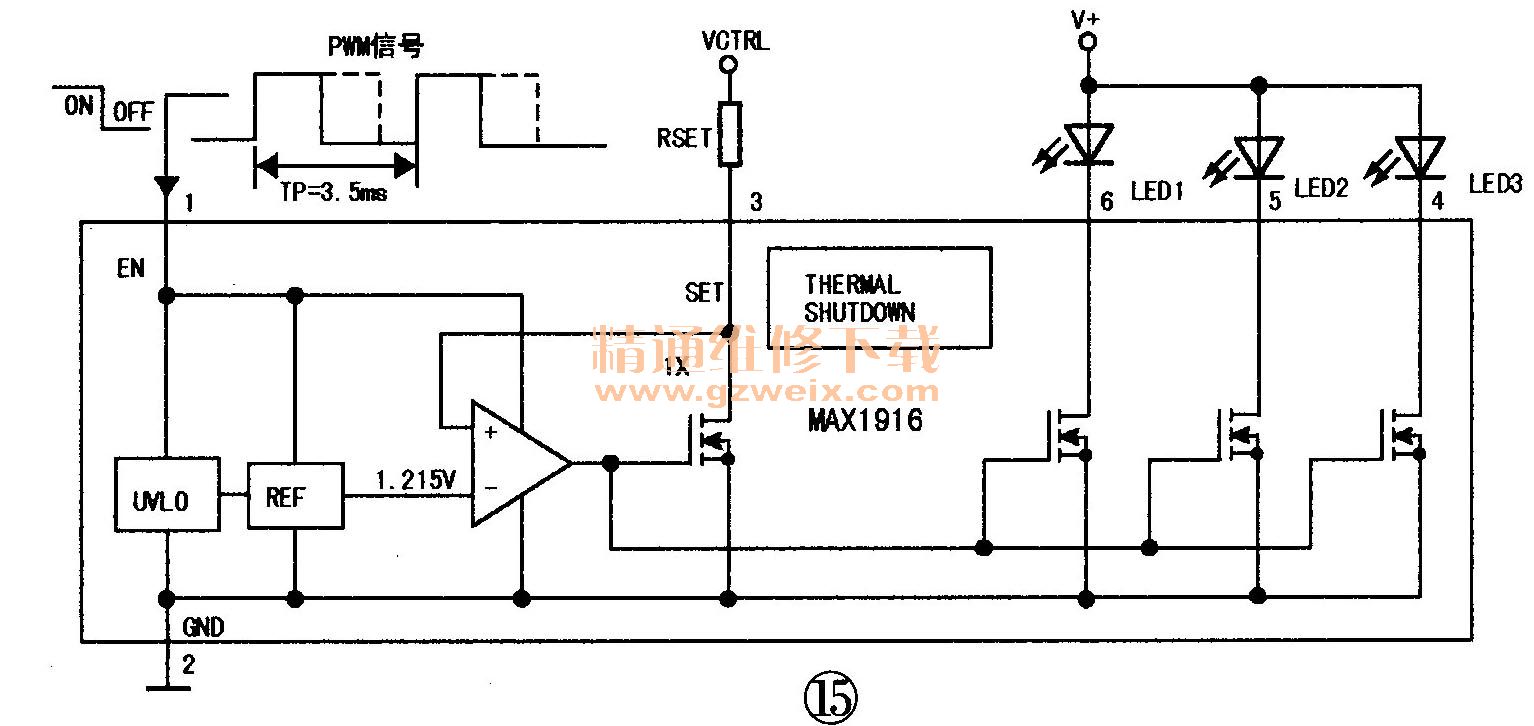 在具体的LED驱动电路中,PWM信号通常由微处理器或ADC电路提供,该信号加到LED驱动芯片的亮度调节端,例如:在LED驱动芯片MAX1916中,PWM信号加到MAX1916的①脚(EN端),如图15所示,当脉冲为高电平时,IC内部的LED控制器让场效应管导通,LED 1~LED3发光;当脉冲为低电平时,IC内部的场效管截止,流经LED1~LED3的漏电流约为1μA,LED1~LED3熄灭。若在一个周期内LED熄灭的时间较长,则看起来整个灯串的发光就较暗,反之则亮。